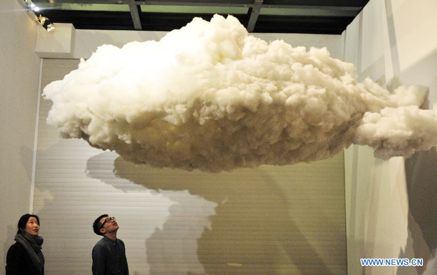 Visitors view an artwork at an exhibition entitled History Re-presented by sculptor Cai Zhisong in Museum of Contemporary Art, Taipei, southeast China's Taiwan, Feb. 18, 2014. (Xinhua/Wu Ching-teng)