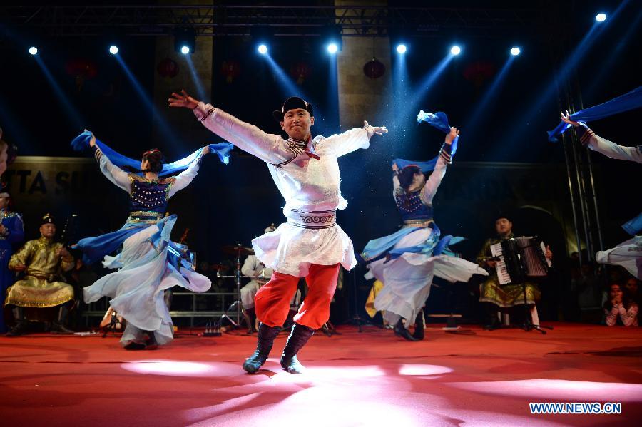 Artists of China's Inner Mongolia Autonomous Region Wulanmuqi Performing Arts Group perform traditional dances in Didim of Turkey on Feb. 25. 2014. "Happy Chinese new year" traditional cultural performances by Chinese Ministry of Culture were held in Didim, Turkey on Tuesday. The folk artists from China's Chongqing brought the intangible cultural heritage performances and Inner Mongolia Autonomous Region Wulanmuqi Performing Arts Group staged a traditional dance performances for local people in Didim. (Xinhua/Lu Zhe)