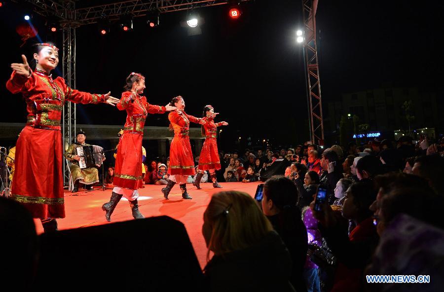 Artists of China's Inner Mongolia Autonomous Region Wulanmuqi Performing Arts Group perform traditional dances in Didim of Turkey on Feb. 25. 2014. "Happy Chinese new year" traditional cultural performances by Chinese Ministry of Culture were held in Didim, Turkey on Tuesday. The folk artists from China's Chongqing brought the intangible cultural heritage performances and Inner Mongolia Autonomous Region Wulanmuqi Performing Arts Group staged a traditional dance performances for local people in Didim. (Xinhua/Lu Zhe)