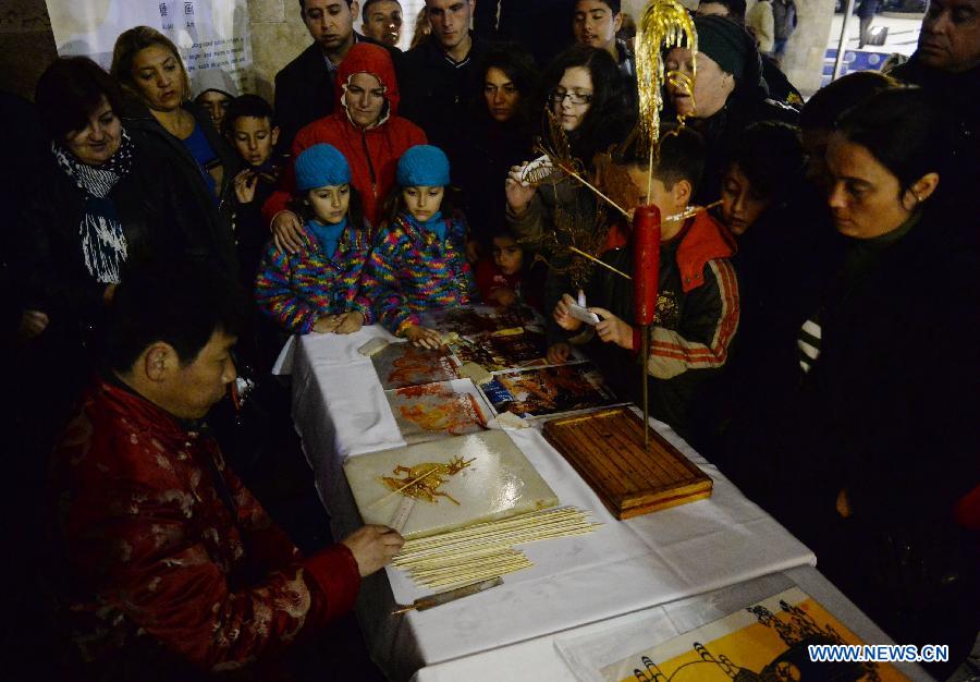 People look at the performance of sugar painting by a Chinese folk artist in Didim of Turkey on Feb. 25. 2014. "Happy Chinese new year" traditional cultural performances by Chinese Ministry of Culture were held in Didim, Turkey on Tuesday. The folk artists from China's Chongqing brought the intangible cultural heritage performances and Inner Mongolia Autonomous Region Wulanmuqi Performing Arts Group staged a traditional dance performances for local people in Didim. (Xinhua/Lu Zhe)