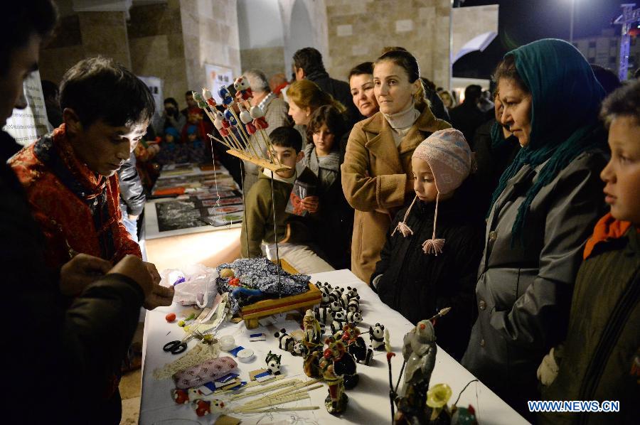 People look at the performance of Dough Figurines by Chinese folk artists in Didim of Turkey on Feb. 25. 2014. "Happy Chinese new year" traditional cultural performances by Chinese Ministry of Culture were held in Didim, Turkey on Tuesday. The folk artists from China's Chongqing brought the intangible cultural heritage performances and Inner Mongolia Autonomous Region Wulanmuqi Performing Arts Group staged a traditional dance performances for local people in Didim. (Xinhua/Lu Zhe)