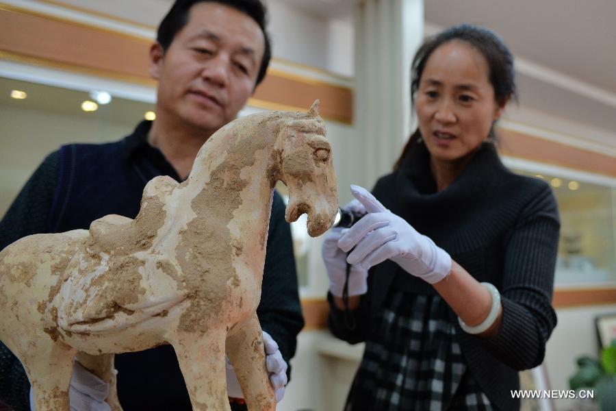 Sun Wanhu (L), the curator of Xionguan museum, and his wife check the cultural relics at the museum in Jiayuguan City, northwest China's Gansu Province, Feb. 26, 2014. Sun Wanhu, a local collector, built the Xiongguan Museum, the first private museum in Jiayuguan City, with more than 620 pieces of cultural relics collected by himself for more than 20 years. (Xinhua/Chen Bin)