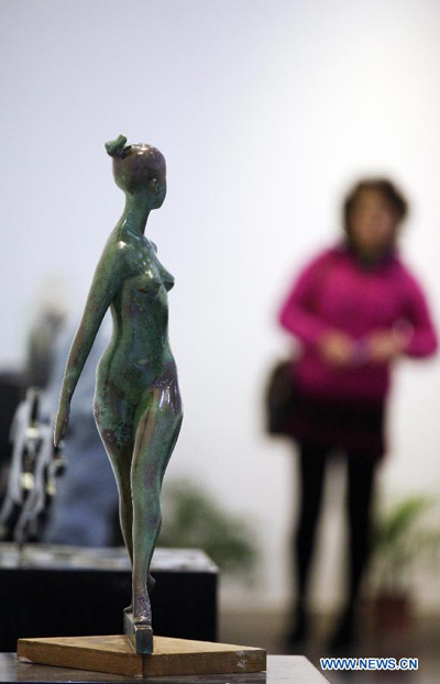 A visitor views a sculpture displayed at a sports sculpture exhibition held at Nanjing Library in Nanjing, capital of east China's Jiangsu Province, March 4, 2014. An exhibition of award-winning pieces selected from International Sports Sculpture Competition was held here on Tuesday. (Xinhua)