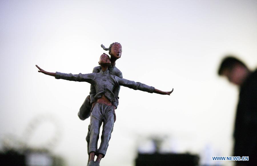 A visitor views a sculpture displayed at a sports sculpture exhibition held at Nanjing Library in Nanjing, capital of east China's Jiangsu Province, March 4, 2014. An exhibition of award-winning pieces selected from International Sports Sculpture Competition was held here on Tuesday. (Xinhua)