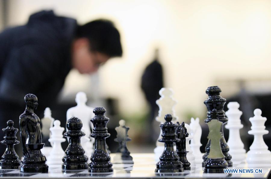 A visitor views a sculpture displayed at a sports sculpture exhibition held at Nanjing Library in Nanjing, capital of east China's Jiangsu Province, March 4, 2014. An exhibition of award-winning pieces selected from International Sports Sculpture Competition was held here on Tuesday. (Xinhua)