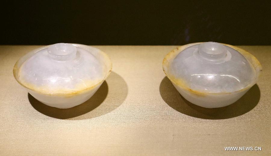Photo taken on March 4, 2014 shows emerald bowls made in the Qing Dynasty (1644-1911) displayed during a tea service & tea culture exposition in Suzhou, east China's Jiangsu Province. The expo will last until April 25. (Xinhua/Chen Yu)