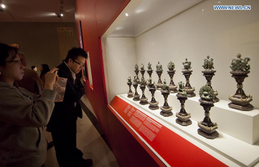 Visitors watch treasures from the Palace Museum of China during the media day of the Exhibition "The Forbidden City: Inside the Court of China's Emperors" at the Royal Ontario Museum in Toronto, Canada, March 5, 2014. This six-month exhibition brings to Canada for the first time about 250 treasures of the Palace Museum of China that were part of Chinese imperial life, and also provides an opportunity for Canadians to learn about China's long and fascinating history and traditional culture. (Xinhua/Zou Zheng)