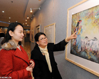 Visitors walk past sculptures displayed at the "New Horizon-Chinese Contemporary Art Exhibition" in Beijing, capital of China, March 7, 2014. The nine-day exhibition kicked off Friday at the National Art Museum of China. (Xinhua/Zhao Bing)