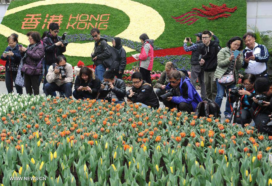 People take photos of flowers at the 2014 Hong Kong Flower Show in Victoria Park in Hong Kong, south China, March 7, 2014. The flower show will be held from March 7 to 16, exhibiting over 350,000 flowers. (Xinhua/Wong Pun Keung)