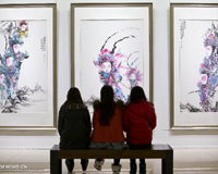 People visit an exhibition of calligraphy and painting works in Beijing, capital of China, March 10, 2014. Hundreds of calligraphy and painting works from modern Chinese artists were on display. (Xinhua/Lu Peng)