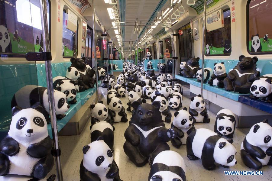 Paper pandas and Formosan black bears are seen in the Taipei Metro during the "Pandas World Tour" in Taipei, southeast China's Taiwan, March 14, 2014. A total of 1,600 paper pandas and 200 paper black bears were on display. (Xinhua/Wu Ching-teng)