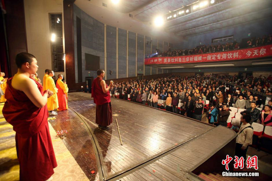 Eminent monks from three Buddhism schools including Pure Land, Zen, and Tantric hold a prayer ceremony on the festival to pray for the passeners on the missing flight MH370 in Taiyuan, China's Shanxi province, March 16, 2014. [Chinanews.com/Zhang Yun]