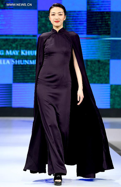 A model shows a creation of a Singaporean designer during the 2014 ASEAN and Chinese Costume Culture Exhibition in Beijing, capital of China, April 8, 2014. (Xinhua/Chen Jianli)