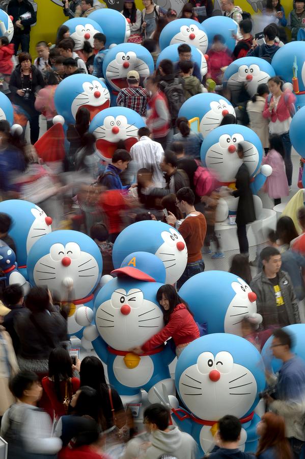 People view Doraemon figures at an exhibition of "100 Doraemon Secret Gadgets Expo" in Beijing, capital of China, April 19, 2014. The exhibition kicked off here on Saturday. A hundred life-size Doraemon figures, each of which bearing a distinct secret gadget, were displayed during the show. Doraemon, a 22nd-century robotic cat, has been a popular anime character since its introduction by Japanese cartoonist Fujiko Fujio in 1969. [Xinhua/Li Xin]