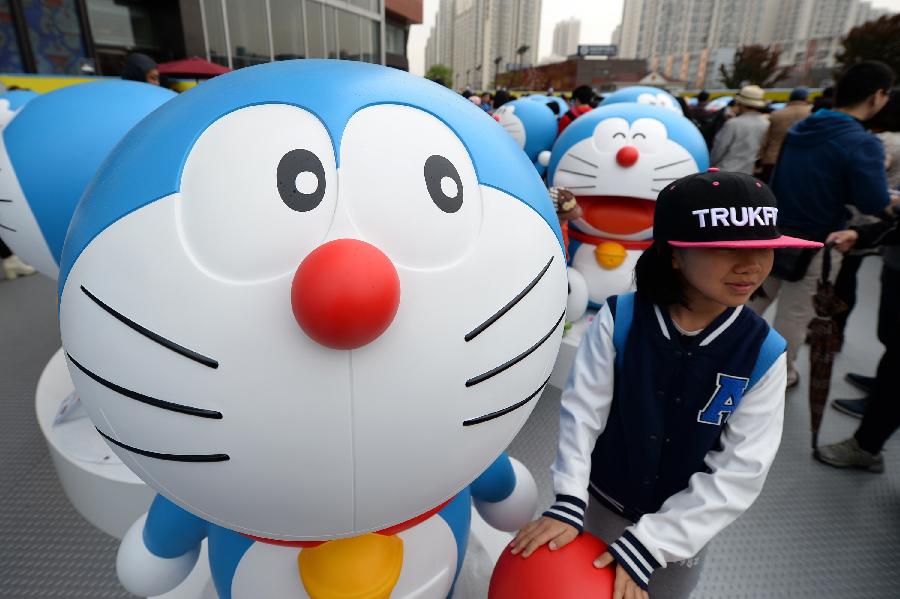 A visitor poses for a photo with a Doraemon figure at an exhibition of "100 Doraemon Secret Gadgets Expo" in Beijing, capital of China, April 19, 2014. The exhibition kicked off here on Saturday. A hundred life-size Doraemon figures, each of which bearing a distinct secret gadget, were displayed during the show. Doraemon, a 22nd-century robotic cat, has been a popular anime character since its introduction by Japanese cartoonist Fujiko Fujio in 1969. [Xinhua/Li Xin]