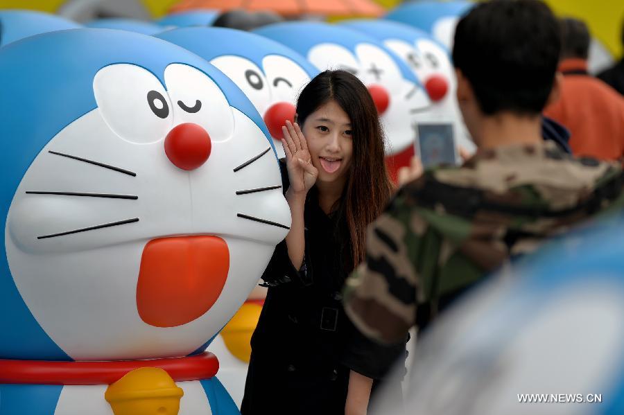 A girl poses for a photo with A Doraemon figure at an exhibition of "100 Doraemon Secret Gadgets Expo" in Beijing, capital of China, April 19, 2014. The eáxhibition kicked off here on Saturday. A hundred life-size Doraemon figures, each of which bearing a distinct secret gadget, were displayed during the show. Doraemon, a 22nd-century robotic cat, has been a popular anime character since its introduction by Japanese cartoonist Fujiko Fujio in 1969. [Xinhua/Li Xin]