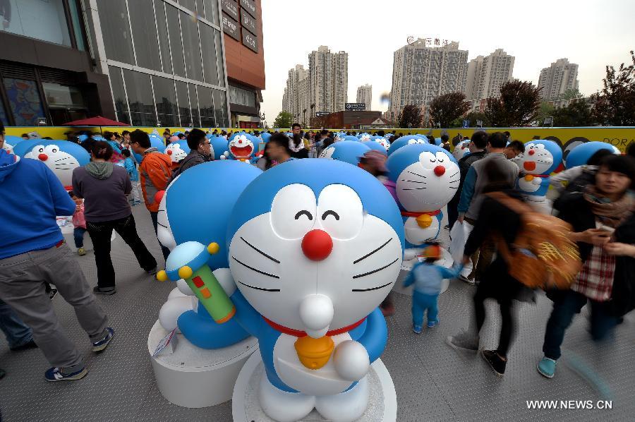 People view Doraemon figures at an exhibition of "100 Doraemon Secret Gadgets Expo" in Beijing, capital of China, April 19, 2014. The exhibition kicked off here on Saturday. A hundred life-size Doraemon figures, each of which bearing a distinct secret gadget, were displayed during the show. Doraemon, a 22nd-century robotic cat, has been a popular anime character since its introduction by Japanese cartoonist Fujiko Fujio in 1969. [Xinhua/Li Xin]