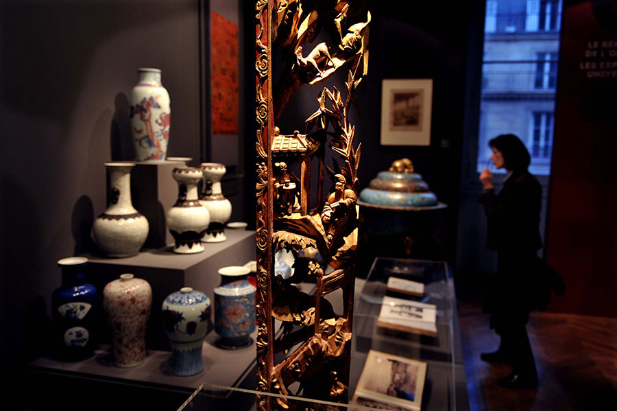 An exhibition of Chinese art treasures is recently launched at the Decorative Arts Museum in Paris to commemorate the 50th anniversary of the establishment of China-France diplomatic relations. The collection, donated by senior collectors in France, includes furniture, clothes, lacquerware, wood carvings, and porcelain, jade, bronze and agate items of the Chinese Ming and Qing dynasties. [Photo/Xinhua]