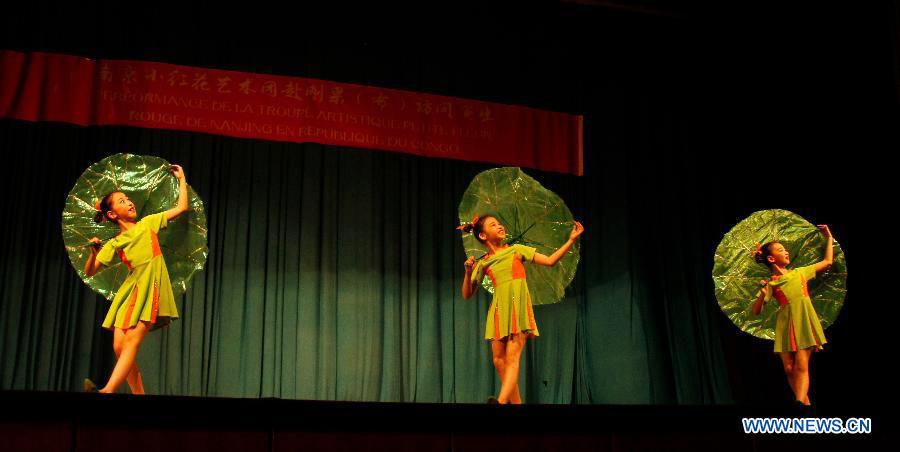 Children actresses from Chinese Nanjing little red flowers troupe dance at the parliament building in Brazzaville, capital of the Republic of the Congo, April 28, 2014. (Xinhua/Liu Kai)