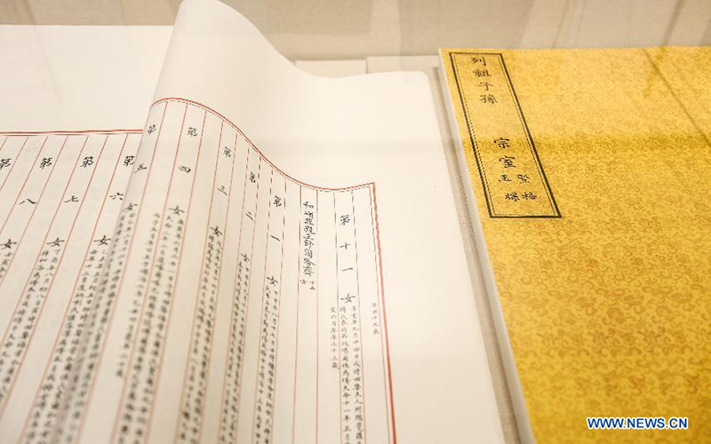 Photo taken on May 2, 2014 shows the royal genealogy of Qing Dynasty (1644-1911) during an exhibition at the Liaoning provincial archives in Shenyang. The exhibition started on May 1. It is the first time since 1661 that the Qing's royal genealogy has been displayed to the public. (Xinhua/Yao Jianfeng) |