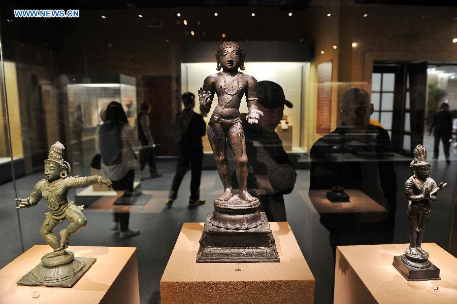 Bronze statues are displayed at "India's Universe", an exhibition of Indian cultural masterworks from the Los Angeles County Museum of Art (LACMA), at the Shanxi Museum in Taiyuan, capital of north China's Shanxi Province, May 2, 2014. "India's Universe" displays 127 pieces of Indian cultural relics collected by the LACMA. The exhibition was inaugurated in Taiyuan on April 29 and will be available until August 3. (Xinhua/Zhan Yan)