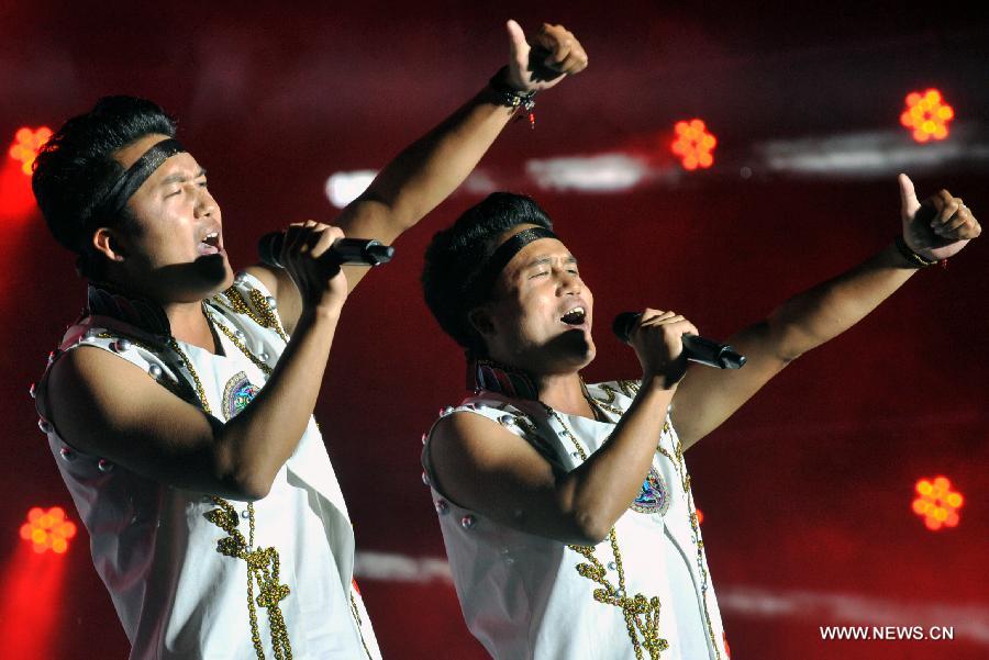 Twin brothers Li Shuangwu and Li Shuangwen perform acrobatics during a talent show of twins in Mojiang Hani Autonomous County, southwest China's Yunnan Province, May 2, 2014. Nine pairs of twins and a set of triplets took part in the event here on Friday. (Xinhua/Chen Haining)