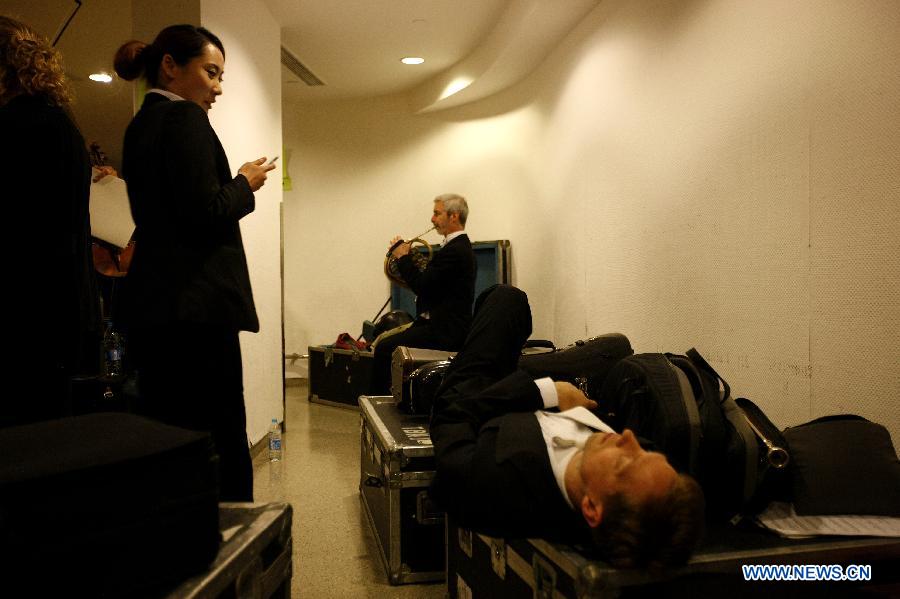 A player with Boston Symphony Orchestra (BSO) takes a rest during intermission at Shanghai Oriental Art Center, in Shanghai, east China, May 4, 2014. The Boston Symphony Orchestra (BSO) made a performance in Shanghai on Sunday. The BSO, the first American orchestra that visited China in 1979 after the two countries established diplomatic ties, made its long-awaited return to the country this May. The BSO is an American orchestra based in Boston, Massachusetts. It is one of the country's five major symphony orchestras commonly referred to as the "Big Five". (Xinhua/Fang Zhe)