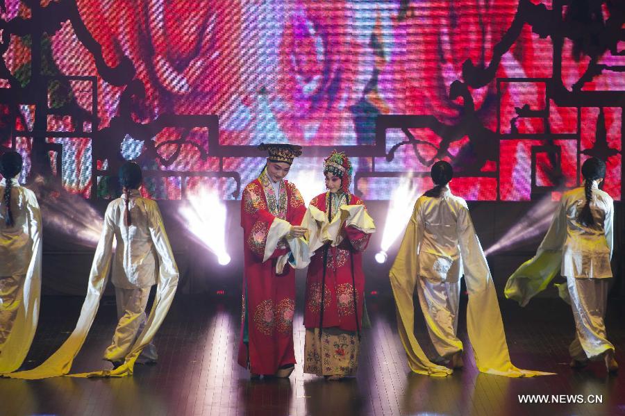 Actors perform in the musical Kunqu opera Peony Pavilion at Tianyou Hall of the Beijing Jiaotong University in Beijing, capital of China, May 8, 2014. (Xinhua/Zhang Cheng)