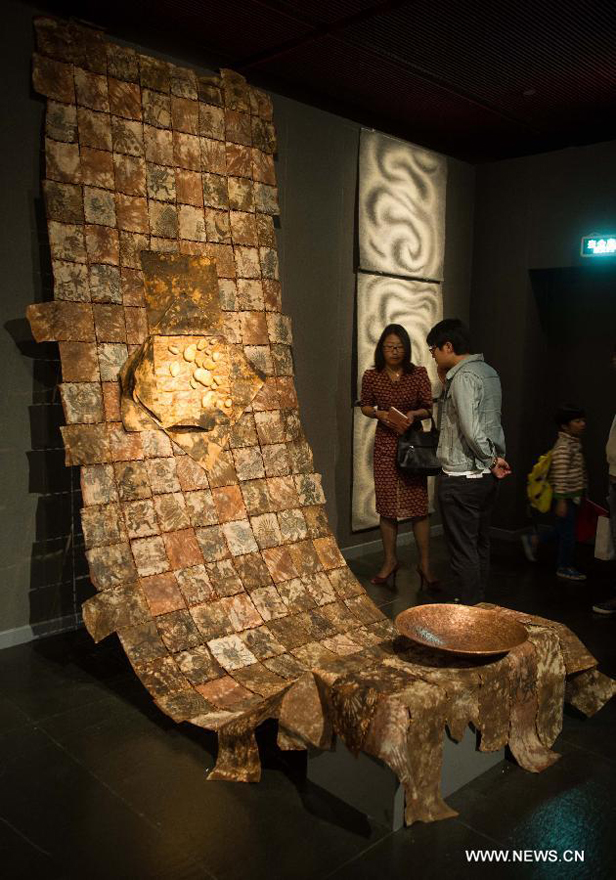 Visitors look at an artwork during an exhibition of Chinese contemporary arts and crafts in Beijing, capital of China, May 10, 2014. A total of 200 pieces of artworks were presented in the exhibition which will last till May 30. [Xinhua/Luo Xiaoguang]