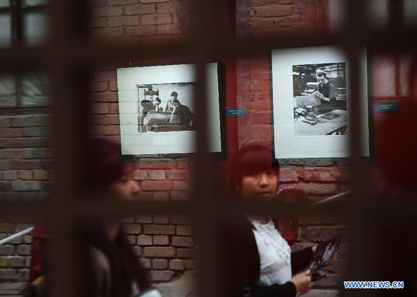 Visitors walk past pictures by French photographer Robert Doisneau at a photo exhibition in Beijing, capital of China, May 14, 2014. An exhibition named Doisneau's Renault kicked off here Wednesday. More than 70 pictures of Doisneau, one of the greatest photographers in the 20th century, are displayed on the exhibition which will last until June 30. (Xinhua/Wang Shen)