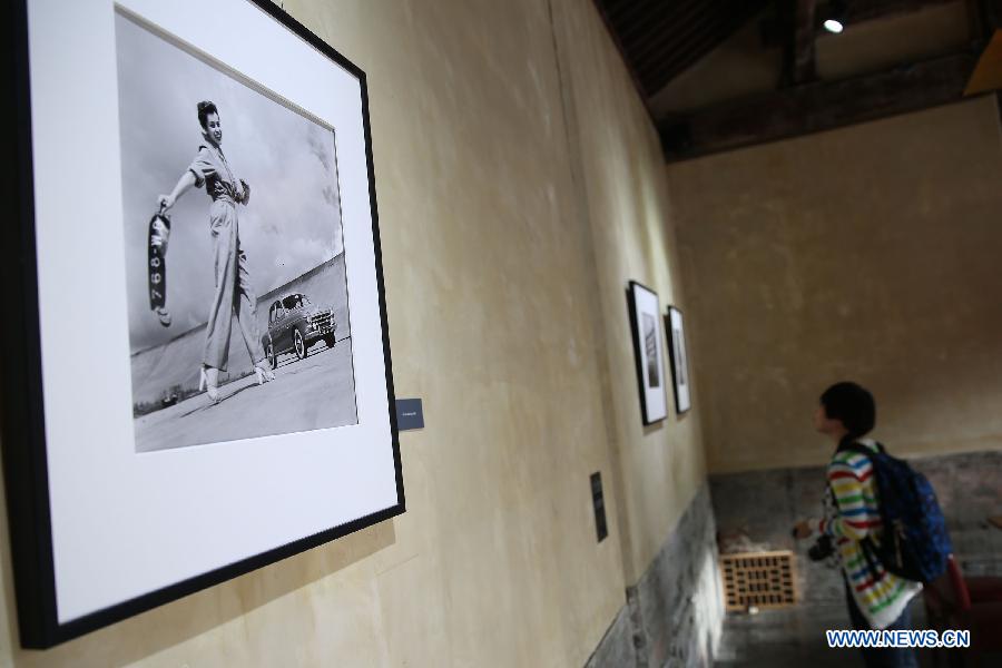 A visitor looks at pictures by French photographer Robert Doisneau at a photo exhibition in Beijing, capital of China, May 14, 2014. An exhibition named Doisneau's Renault kicked off here Wednesday. More than 70 pictures of Doisneau, one of the greatest photographers in the 20th century, are displayed on the exhibition which will last until June 30. (Xinhua/Wang Shen)