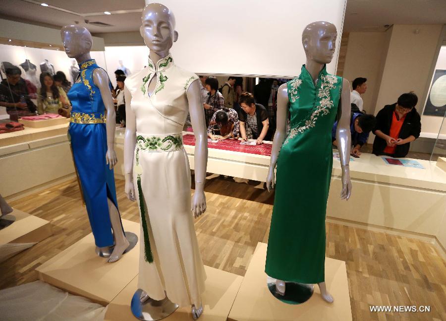 Visitors view cheongsams, a traditional Chinese women's dress also known as Qipao, during an exhibition at the Nanjing Museum in Nanjing, capital of east China's Jiangsu Province, May 17, 2014. (Xinhua/Wang Xin)