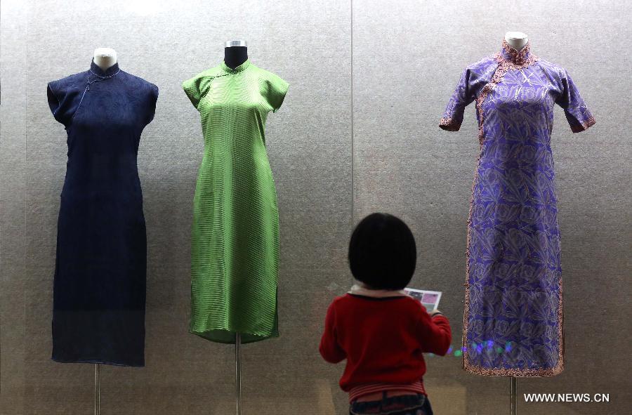 A young girl views cheongsams, a traditional Chinese women's dress also known as Qipao, during an exhibition at the Nanjing Museum in Nanjing, capital of east China's Jiangsu Province, May 17, 2014. (Xinhua/Wang Xin)