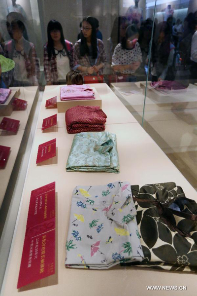 Visitors view cheongsams, a traditional Chinese women's dress also known as Qipao, during an exhibition at the Nanjing Museum in Nanjing, capital of east China's Jiangsu Province, May 17, 2014. (Xinhua/Wang Xin)