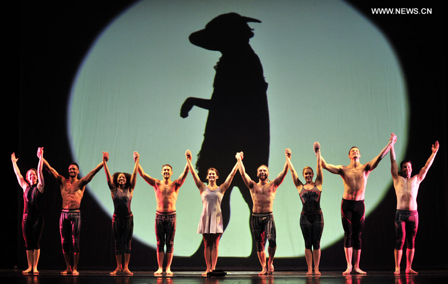 Artists from American shadow dance company Pilobolus greet the audience during a press rehearsal for "Shadowland" in Taipei, southeast China's Taiwan, May20, 2014. Pilobolus' shadow dance "Shadowland" will be staged inTaipei from May 20 to 24. (Xinhua/Wu Ching-teng)