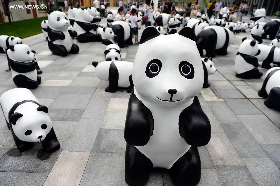 Lovely "pandas" are seen during the "1St panda" exhibition at Kerry Center Square in Shanghai, east China, June 2, 2014. A total of 100 pandas made of leftover moso bamboos were displayed during the exhibition. (Xinhua/Lai Xinlin)