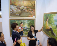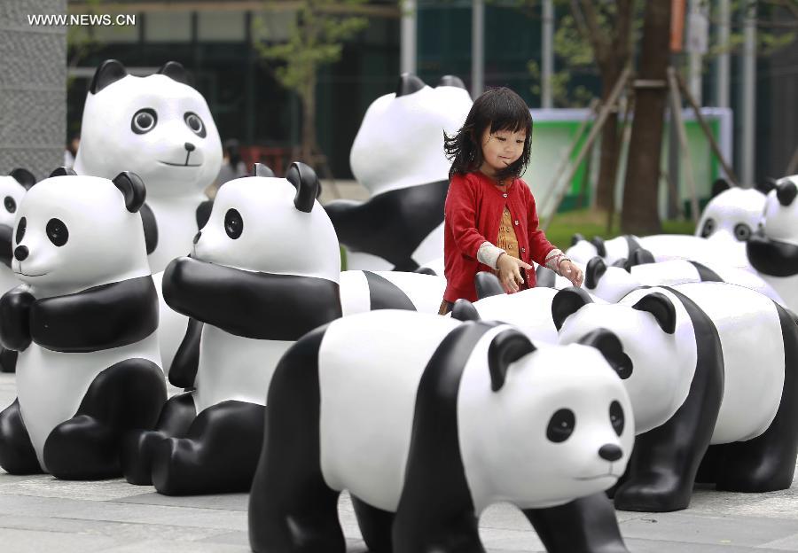 A child watches lovely "pandas" during the "1St panda" exhibition at Kerry Center Square in Shanghai, east China, June 2, 2014. A total of 100 pandas made of leftover moso bamboos were displayed during the exhibition. (Xinhua/Ding Ting)