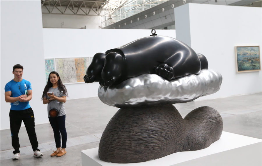 Visitors enjoy a sculpture at the Xinjiang International Convention and Exhibition Center in Urumqi, the capital city of Xinjiang Uygur autonomous region, June 24, 2014. [Photo by Li Xiongxin/Asianewsphoto]