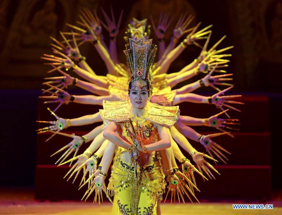 Actresses stage the acrobatic pantomime "Dunhuang Goddess" in Dunhuang, northwest China's Gansu Province, June 28, 2014. Based on stories from Mogaoku Grottos murals, the performance was created in 2007 and involved with acrobatics, music, dance and martial art. [Xinhua/Nie Jianjiang]