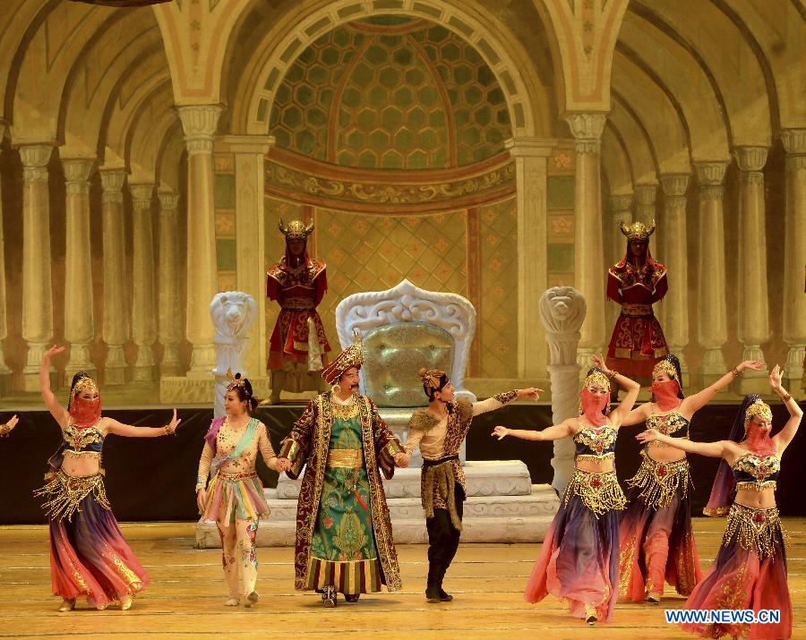 Actors stage the acrobatic pantomime "Dunhuang Goddess" in Dunhuang, northwest China's Gansu Province, June 28, 2014. Based on stories from Mogaoku Grottos murals, the performance was created in 2007 and involved with acrobatics, music, dance and martial art. [Xinhua/Nie Jianjiang]
