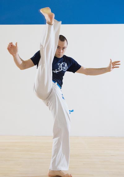 An instructor performs a basic move of Capoeira, or Brazilian war dance, in Shanghai on June 28, 2014. Capoeira, a type of dance that fuses art and martial arts, was preserved by Asian immigrants in Brazil in the 16th century. [Photo by Gao Erqiang/Asianewsphoto]