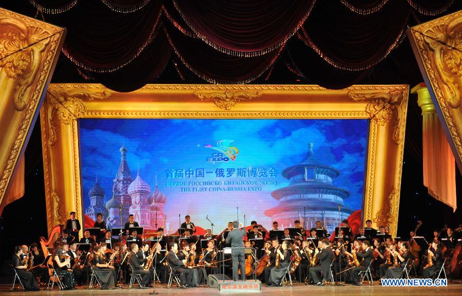 Harbin Symphony Orchestra perform during the opening ceremony of the first China-Russia Expo in Harbin, capital of northeast China's Heilongjiang Province, June 29, 2014. The Expo's predecessor was China Harbin International Economic and Trade Fair initiated in 1990. It was upgraded to an exposition earlier this year to focus on bilateral cooperation. (Xinhua/Wang Jianwei)