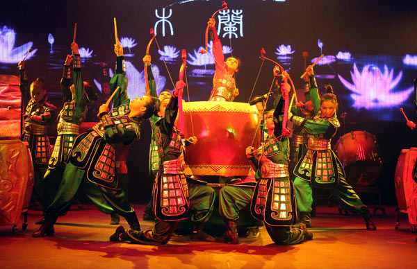 Mulan stages the story in 14 scenes using a synchronized drumming and choreography, pantomime, dance and plot summaries (in English) displayed on large projection screens. The 12-member Red Poppy Ladies troupe, including Du Qianqian who plays the lead character Mulan, thumps on large tub drums, tables and the floor with bare hands and sticks.