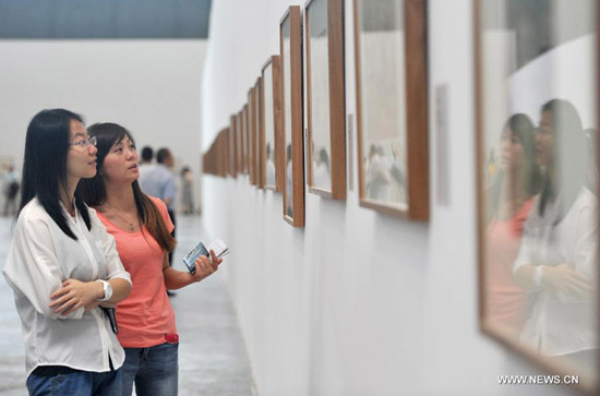 Audience watch artworks during the 1st Xinjiang International Art Biennale in Urumqi, capital of northwest China's Xinjiang Uygur Autonomous Region, June 25, 2014. Hundreds of artworks by 132 artists from 18 countries were presented during the biennale. [Xinhua/Wang Fei]