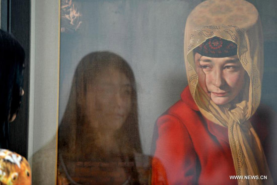 A woman looks at a painting during the 1st Xinjiang International Art Biennale in Urumqi, capital of northwest China's Xinjiang Uygur Autonomous Region, June 25, 2014. Hundreds of artworks by 132 artists from 18 countries were presented during the biennale. [Xinhua/Wang Fei]