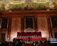 (From L to R) Pianist Rueibin Chen, Chinese singer Song Zuying, conductor Perry So, and Chinese-American singer Leehom Wang acknowledge the applause after performance with Los Angeles Philharmonic Orchestra during a concert featuring Chinese music at Hollywood Bowl, Los Angeles, the United States, on July 5, 2014. [Photo/Xinhua]