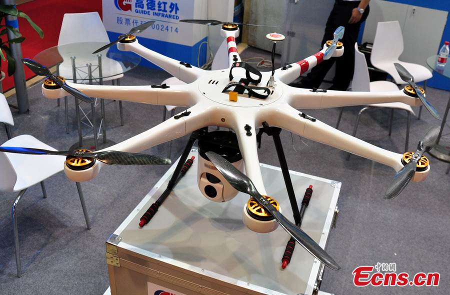 Photo taken on July 9, 2014 shows a multi-rotor unmanned aerial vehicle (UAV) which is on display at the “China UAV conference and exposition” in Beijing. The event features 70 types of latest unmanned planes made for different industries including military, agriculture, electricity, and meteorology. Starting from 2006, four sessions of the event has been held. [Photo: China News Service/ Chen Haifeng]