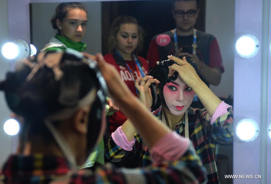 Athletes watch an actress doing her makeup during a visit to Jinling Theater at Laomendong, Nanjing, capital city of east China's Jiangsu Province, August 24, 2014. Young athletes are invited by the 2014 Nanjing Youth Olympic Games organizing committee to an traditional opera tour to Jinling Theater where they enjoy performance of traditional Chinese opera, including Beijing opera, Kun opera and so on.[Photo/Shen Peng]