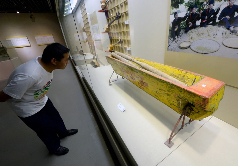 A visitor looks at a Zhuang rice huller.[Photo by Shi Jianxue/asianewsphoto.com]