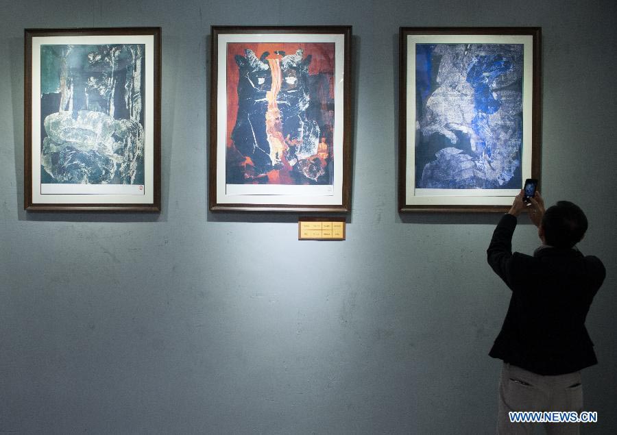 A visitor takes photos at the art exhibition of Chinese Artist Jiang Bibo, which lasts from Oct 16 to 31, at the Zhongshan Cultural Industry Park in Chongqing municipality, Southwest China, Oct. 16, 2014.[Photo/Xinhua]